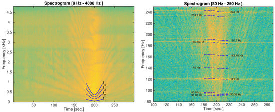 Let us now select one of the recordings containing a ship passing within the range of the SAMARUC system. The spectrogram for these real signals is shown in the left panel of Figure 9, and it is easy to see the U-shaped patterns due to the destructive interference varying with time. A magnified region of this spectrogram is shown in the right panel of Figure 9 where the Doppler effect can be measured. The fundamental frequencies of the ship engine are estimated using a time-frequency peak detector. Specifically, for the example shown, Hz.