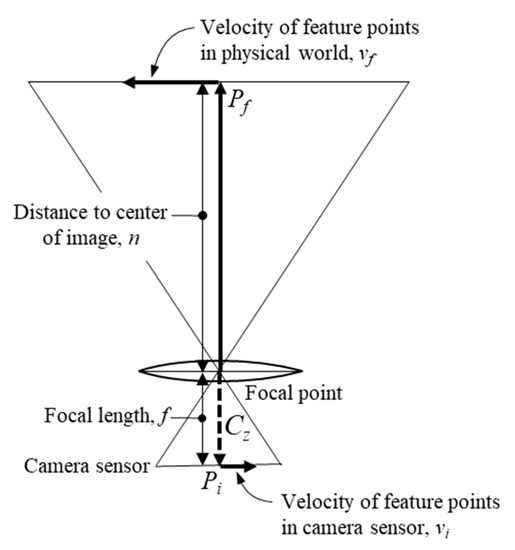 is the location of the corresponding feature point in the image reference frame, n is the normal distance from the optical axis to the feature point, and f is the focal length. We can take the time derivative of Equation (5) to give us the velocity of the feature point in the camera frame. Once the derivative is taken, the equation can further be simplified since the focal length does not change with time (only valid for fixed focal length cameras) and the velocities of the feature points are averaged at the center of the image giving us Equation (6):