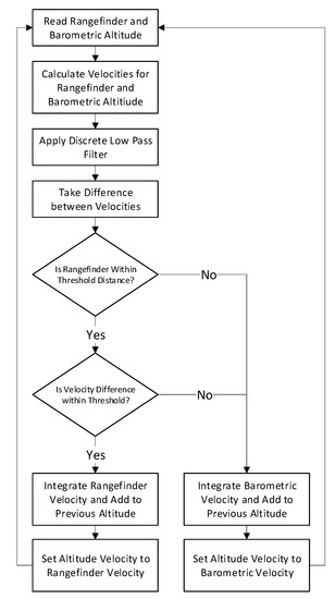 R in Equation (12)) and compares it to the velocity of the rangefinder altitude derived from the Fixed Gain Kalman Filter described in Equation (9) to identify and eliminate these discontinuous jumps. When the difference between these velocities is above a specified threshold, the system will revert back to utilizing barometric-pressure based altitudes, as illustrated in