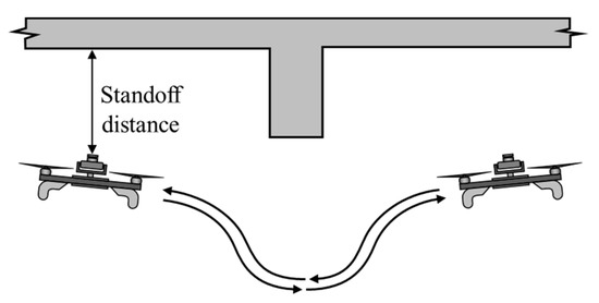 For conducting bridge inspections, the following procedure was utilized to optimize the speed and efficiency. Since the aircraft has vertical obstacle avoidance utilizing a single, narrow beam laser, the vehicle should travel parallel to the bridge girders. This would result in the aircraft following the curve of the bridge deck while minimizing changes in altitude from traversing perpendicular to the girders themselves. Another benefit of flying between the girders is the aircraft can fly closer to the bridge deck for a given standoff distance, thus allowing for closer views of the bridge defects. For the inspections, the standoff distance was adjusted so that the distance exceeds the depth of the bridge girder. This was done so to prevent the aircraft from impacting the side of the girder. To fly at closer distances, the aircraft would need to be equipped with either propeller guards or automatic horizontal obstacle avoidance [