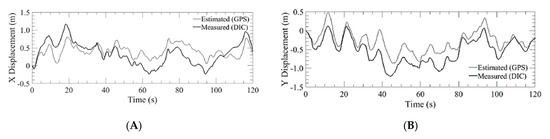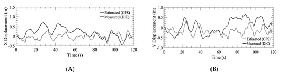 Lateral displacement estimated by GPS of the bridge inspection airframe versus the measured value of the DIC for run 3 where: (A) X displacement; (B) Y displacement.