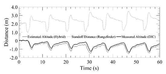 To maintain a safe distance below the bridge deck, the aircraft utilizes an upward facing laser rangefinder. The rangefinder measurements are first run through a fixed gain Kalman filter before being passed to the aircraft’s obstacle avoidance algorithm. The form of the Kalman filter is shown in Equations (9) and (10):