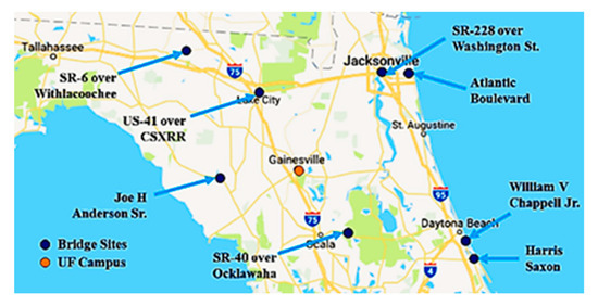 Locations of bridges inspected by UF aircraft (reprinted with permission from Tomiczek, A.
