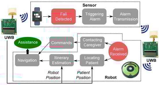 A first design choice for this project was that the fall detection sensor consisted of a single unit positioned on the wrist or the chest so that it could be embedded in a wrist-band or in a pendant. In addition, we aimed to avoid any alarm notification loss during the transmission between the wearable sensor and the robot. Finally, we required that the UWB-based system provided a position tracking resolution of at least 25 cm to locate the older adult and the robot in the home environment.