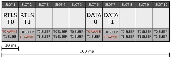 The WSN supported the exchange of messages between units while enabling the real-time localization of the radio tags. The WSN communication protocol between units (e.g., T0 and T1) relied on the Time-Division Multiplexing (TDM) protocol, in which the exchange of messages occurs in a time frame called superframe, Figure 3. The superframe corresponds to a TDM cycle composed of 8 time-slots for the TWR protocol and 2 time-slots dedicated to the anchor communication for a total of 10 time-slots of equal duration. Only one radio tag per slot is allowed to transmit over the UWB channel, while the other radio tags are in idle mode. The Anchor0 is the TDM master and is responsible for assigning and maintaining radio tags in their time-slots.