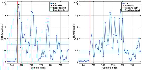 where C is the channel input response power, N is the preamble accumulation count, and A is a predefined constant (115.72 for a pulse repetition frequency of 16 and 121,72 for 64 ). Intuitively, anchors affected by NLOS would display a lower RSL value due to the signal attenuation associated with the presence of the obstacle that obstructs the LOS. The RT parameter is defined as the difference between the time of arrival of the maximum peak of the CIR time-series and the first peak above the threshold noise level. In LOS conditions, the two are expected to coincide because the impulse traveling through the most direct path is the least attenuated and the first to be detected. Finally, the FPG parameter is the ratio between the first peak amplitude and the CIR maximum. This feature varies in the range between 0 and 1. Lower values are associated with NLOS conditions, where the maximum of the CIR is due to multipath transmission, and the first peak is associated with the packet that is attenuated by the presence of an obstacle. Example of data collected in LOS and NLOS conditions are shown in Figure 4.