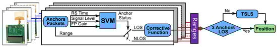 Schematic representation of the location tracking algorithm. The estimated range (i.e., distance) values of the anchors in NLOS conditions are used to estimate the position if the radio tag only if less than three anchor units have direct LOS to the radio tag.