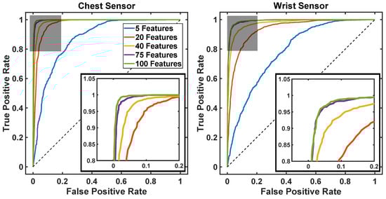 Figure 6 shows the ROC curves derived from the data collected using a sensor on the chest (left panel) and on the wrist (right panel). These results were obtained by using data features derived from the none-axis units, i.e. the accelerometer, gyroscope and magnetometer time series. Different ROC curves are shown to highlight the effect of choosing different numbers of data features.