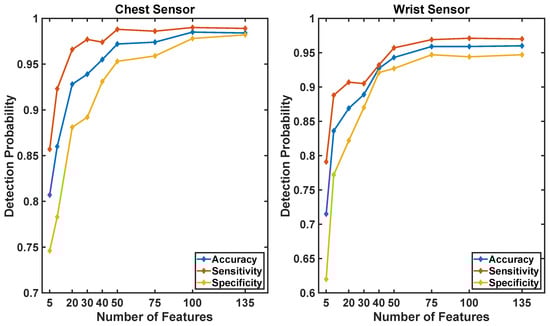 Figure 7 shows the accuracy, sensitivity, and specificity of the machine learning algorithm as a function of the number of features used by the model. The sensitivity and specificity values plotted in this figure were derived by choosing the operating point of the ROC curves shown in Figure 6 associated with maximum accuracy.