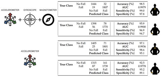 Our work expanded on the study carried out by Ozdemir [] by first attempting to improve the accuracy of the detection of fall events by relying on data collected using nine-axis units and then assessing if it is possible to obtain comparable results by using data features from a single tri-axial accelerometer. The latter would relax the sensor hardware constraints, reduce cost and increase battery life. In our analysis, we focused on using the units positioned on the wrist and the chest as they could be embedded in a wrist-band or a pendant, respectively, two form factors that are very popular and typically accepted by most end-users.