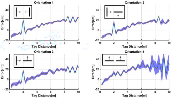 Error affecting the estimates of the distance between the anchor unit and the radio tag for different orientations of the antennas. The error is higher for orientation 4 where both the antenna of the anchor unit and the antenna of the radio tag are aligned. The red dots represent the tested data points. The blue areas represent the variance of the estimates.