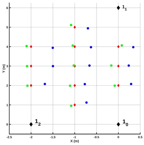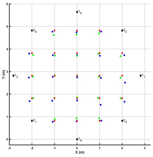 Comparison of the results obtained with vs. without correction algorithm when eight anchor units were used to derive the position of the radio tag. The black markers represent the coordinates of the anchors. The red markers represent the actual position of the radio tag for all tested positions, the blue markers represent the estimated positions before the correction algorithm was applied, and and the green markers represent the coordinates after the correction algorithm was applied.