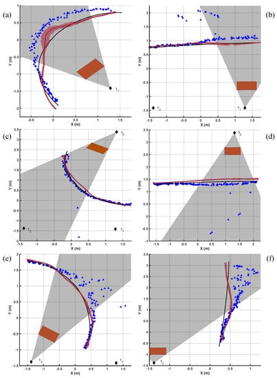 The six subfigures (a–f) represent dynamic tests, with the robot moving along six different trajectories. (a,c,e) represent circular trajectories, while (b,d,f) are linear ones. The black line represents the position measured by the Vicon system, while the blue markers are the coordinates estimated originally by the Decawave kit. The marker shapes are triangular if the SVM classified the point as collected in NLOS conditions or circular when LOS was predicted. The red line in the graph is the corrected trajectory with the shaded area showing the variability computed as standard deviation within the moving average window. The black diamonds show the positions of the anchors while the red rectangles represent the position of the obstacles. Finally, the grey area is a rough estimate of the field of view in which the anchor operates in NLOS conditions.