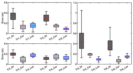 NLOS error distribution before (dark grey boxes) and after the correction (light grey boxes) for the six different trajectories. The light blue boxes represent the error for the LOS points. For the graph clarity, the 6 trajectories have been divided into three subplots with different ranges. Starting from the top left, counterclockwise, are shown the error distributions of the trajectories from one to six, which correspond to the ones in Figure 12 from (a–f).
