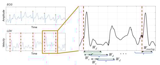 A sliding-window algorithm was used to process the LDV signal to detect heartbeat. The LDV signal was divided in overlapping windows, and each window was assigned with a class beat or no-beat, using the ECG as the gold standard. To detect the R peak in the ECG, the Pan–Tompkins algorithm [39] was used.
