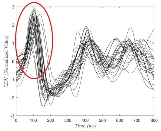 Each curve refers to one subject and is the average of a portion of the LDV signal. The portion starts from the R peak in the electrocardiograph (ECG) and last 800 ms. The red circle shows the LDV pulse wave peak that can be found at 102 ± 15 ms after the R-peak.