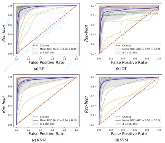 Receiver operating characteristic (ROC) curves obtained using the LDV-beat dataset with (a) Random Forest (RF), (b) Decision Tree (DT), (c), K-Nearest Neighbor (KNN) and (d) Support Vector Machines (SVM). Each ROC refers to a subject. The area (AUC) under the ROC is shown, too.