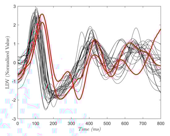 In Figure 5, the ROCs obtained with the tested classifiers are reported. The curve for each leave-one-out run is plotted along with the mean curve among all the 28 runs, for each of the tested classifiers. The obtained AUC reached a mean value of 0.96 (RF), 0.90 (DT), 0.94 (KNN) and 0.95 (SVM). No statistical differences were found between the AUCs obtained with the tested classifiers (p-value = 0.08). Two subjects showed a lower value of the AUC with respect to the other 26 subjects. This was seen for all the classifiers. The reason may be attributed to the peculiar characteristics of the LDV in those two subjects, as shown in Figure 6. The red LDV signals, which refer to the two subjects, had a different shape with respect to the other signals.