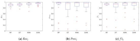 Figure 7 shows the boxplots of the , , for the class beat. The SVM achieved better performance when compared with the other classifiers, with median values for , and of 0.96, 0.96, 0.96, respectively. Table 1 shows the median value of the , and for the class beat and no-beat, for each classifier. Hence, each leave-one-out training run resulted in a value of , and , for a total of 28 values for each classifier. No statistical differences were found between the four models in terms of (p = 0.98) and (p = 0.98) for the beat class. Instead, we found statistical differences when comparing the of the beat class of SVM with respect to that of RF and DT. The SVM correctly classified 22,374 samples, with only 5263 (one order of magnitude lower) misclassified signal windows. Here, we decided to show only the results relevant to SVM for space constraint.