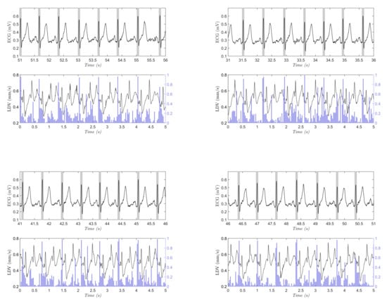In Figure 8, an example of the results obtained when testing the SVM on one full-length, (10 min long), LDV signal is shown. The test consists of classifying a portion of signal with a length of = 75 samples with a sliding windows approach presented in Section 2.2. In this case, = 15 samples were used to improve the computational capacity of the classification having a better simulation in real-time. The blue lines refer to the probability for a window to belong to the beat class, as resulted from the SVM classification. In each graph is reported the synchronous ECG signal with the R peaks highlighted by gray bands. The same procedure was performed on each LDV signal acquired on the 28 subjects. The macro-average metrics were used for performance evaluation in the full-length (10 min long) signals, because the signals presented highly imbalanced class distribution. As suggested in the literature [54], macro-average metrics allow to better represent the overall classifier performance in the presence of imbalanced data.