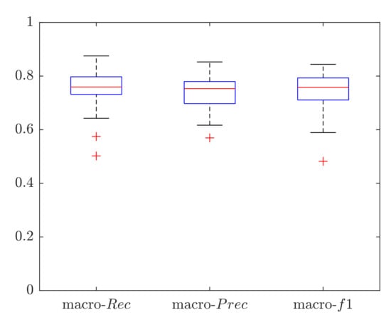Macro performance was computed, obtaining a macro-Rec, macro-Prec and macro-f1 median value of 0.76, 0.75 and 0.76, respectively, as shown in Figure 9. The subject who obtained the best results achieved a macro-Rec, macro-Prec and macro-f1 of 0.87, 0.85 and 0.84, respectively. The results in terms of ROC curves with the mean AUC are shown in Figure 10, the mean AUC among the 28 signals of 0.83.
