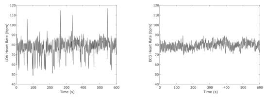 Figure 11 shows an example of the computed HR using the result from the SVM classifier on the full-length (10 min long) LDV signal in comparison with the HR obtained from the ECG for one subject. To compute the HR from the SVM classification, for this test, only the windows that show a heartbeat probability result higher than 0.9 were considered. Only the heartbeats with higher probability were considered in case of adjacent detected heartbeats.
