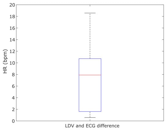 The differences of the mean HRs resulting from the LDV analysis and the ECG for each subject were computed and shown in Figure 12. The median error of 7.8 bpm between the LDV and ECG was found.