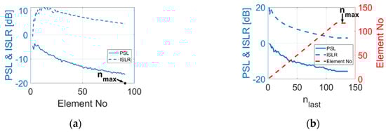 For the random array and the sunflower spiral array, the maximum number of elements varies with the settings of both and . Therefore, for these two configurations, there is no requirement to introduce new parameters based on the number of elements. Simulations were processed to find the relationship between element number and PSL as well as ISLR. The results are shown in Figure 2. For the random array, 50 samples were simulated for each element number, and the minimum values for PSL and ISLR are presented in Figure 2a. As illustrated in the figures, for both random array and sunflower array, PSL and ISLR tend to decrease with the increase in element numbers. Thus, for random array and sunflower array, the number of elements within an array is set to equal the upper limit of the element number and only and are variable in the optimisation process.