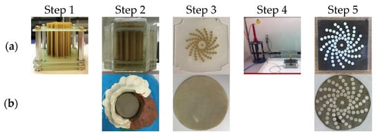 The key difference between the fibre CECAT and the C1–3 transducers is the active layer manufacturing process, as illustrated in Figure 5, and corresponding piezoelectric microstructure. The following description of the CECAT fabrication process relates to the process stages illustrated in Figure 5a. (1) For the CECAT active layer, a jig was made to hold the fibres in the desired positions, corresponding to the array element locations illustrated in Figure 3g, to facilitate fabrication. The volume fraction of each individual active array element was calculated to be 50%, which ensured good piezoelectric performance and manufacturability of the device [15]. Then, 250 μm PZT5A fibres (Smart Material Corp., Sarasota, FL, USA) were selected as the piezoelectric material. Therefore, each individual array element, which has a 0.95 mm radius, contains 28 individual fibres. (2) The jig with the fibres was placed inside a rectangular mould and CIBA-GEIGY CY221-HY956 epoxy (medium set) poured into the mould and left to cure. This medium set material was selected from the CUE materials database as it provided a compromise between low longitudinal attenuation and high shear attenuation whilst, importantly, being suitable for machining [26]. (3) After curing processing, the composite was then machined to 0.75 mm thickness to achieve the 2 MHz operating frequency. (4) Before applying the log spiral electrode pattern, the fibre CECAT active layer was fully electroded using silver paint (AGG302, Agar Scientific Ltd., Essex, UK) and poled. The fibre CECAT active layer was polarised at 1.5 kV for 15 min, at room temperature, in accordance with the PZT fibre manufacturer’s guidelines [25]. (5) Finally, the silver paint was removed from the material and array electrodes were added to one face of the poled CECAT composite slice using metallic evaporation through a mask representing the log spiral array layout—see Figure 3g—while the ground electrode was applied by fully covering the other face of the slice through the same evaporation process. Silver (Ag) was used as the material for electrodes (~500 nm), with a thin layer (~20 nm) of chrome (Cr) evaporated first to improve adhesion to the active material.