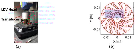 (a) Illustration of the experimental setup for mechanical cross-talk measurement. (b) Illustration of how the LDV scanning was processed. The black circle represents the fired array element. The blue block represents the area that was scanned.