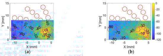 Cross-talk contours for (a) the CECAT and (b) the C1–3 when firing the first element in the 3rd arm individually. The red circles represent the theoretical position of the neighbouring elements.