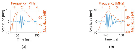 Pulse-echo responses were successfully acquired from all 79 array elements from the C1–3, with three array elements from the CECAT failing to record a satisfactory response. Figure 9 presents example pulse-echo responses and corresponding spectra of the centre element from the CECAT and the C1–3. Table 4 lists the average values of central frequency, −20 dB pulse length, bandwidth and for all the working array elements in each transducer. The centre frequency is 1.95 MHz for the CECAT and 1.85 MHz for the C1–3, both of which are slightly lower than 2 MHz desired working frequency. The averaged for the CECAT is ~50% lower than the C1–3 measured performance. These results indicate that the CECAT has better spatial resolution, while the C1–3 performs better in terms of sensitivity.