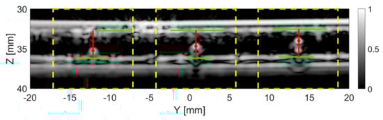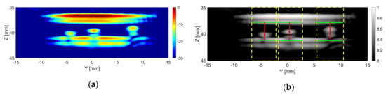 An example current frame from the CECAT with the particles detected: (a) is the TFM image and (b) presents the particle detection algorithm image result. The dashed yellow lines indicate the regions in which a particle was detected. The solid red lines represent the distance from the particles (red dots) to the top and bottom inner walls of the tube (solid green lines).