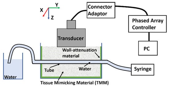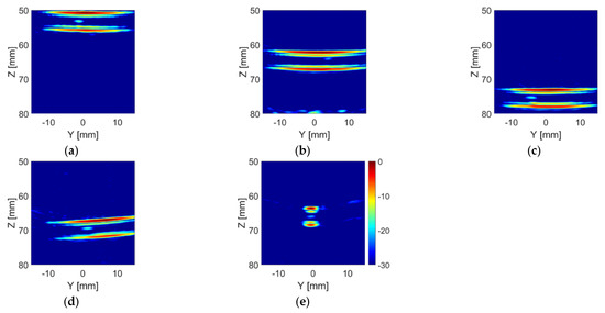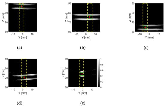 Figure 13 illustrates the basic structures of these lab phantoms. For the first three lab phantoms, as shown in Figure 13a–c, the tubes were placed in parallel with the y-axis at depths of 55, 65 and 75 mm from the top surface of the TMM, respectively. These distances were selected to match typical distances from the targeted blood vessels to the temporal window [34,35,36], with the tube aligned in parallel to the transducer front face. It should be noted that the tube used in these phantoms differs from the tank-tube phantom and has an inner diameter of 1/8 inch or 3.175 mm (Cole-Parmer UK, St Neots, Cambridgeshire). To broaden the scope of this experimental evaluation, two additional configurations, at a distance of 65 mm, were fabricated, with the tube located with a small angular orientation with respect to the configuration shown in Figure 13b. For the phantom shown in Figure 13d, the tube was firstly placed along the y-axis at 65 mm from the top surface of the TMM and then adjusted to have a 5° angle with respect to the y-axis in the Y-Z plane (i.e., vertical to the front surface of the transducer). For the phantom shown in Figure 13e, the tube was firstly placed along the x-axis at 65 mm from the top surface of the TMM, i.e., at right angles to the original configuration illustrated in Figure 13b. Moreover, the tube was also adjusted to have a 5° angle with respect to the x-axis in the X-Y plane (i.e., horizontal to the front surface of the transducer). These phantoms will be referred to as the 55 mm phantom, the 65 mm phantom, the 75 mm phantom, the Angle V phantom and the Angle H phantom, respectively.