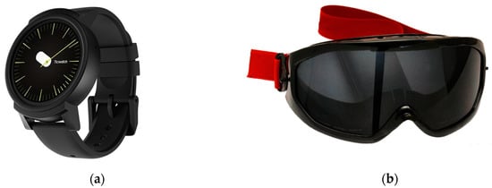In the absence of an available dataset containing inertial sensor data collected with wrist-worn devices adequate for gait abnormalities analysis, we decided to conduct our own data collection procedure. For this purpose, 18 subjects were selected (8 males, 10 females, aged 19–54). Each subject wore two commercial smartwatches (one on each wrist), Mobvoi TicWatch E (Figure 1a), running on a Wear OS operating system, and impairment glasses (Figure 1b) [30].