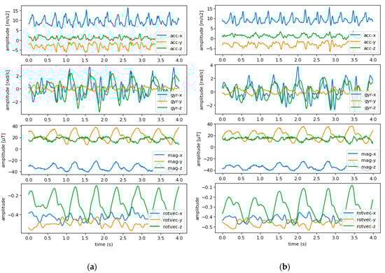 An example of two motion samples of 8 s from the smartwatch worn on the right wrist of one subject. (a) Normal walk; (b) abnormal walk. Acc—accelerometer, gyr—gyroscope, mag—magnetometer, rotvec—rotation vector.