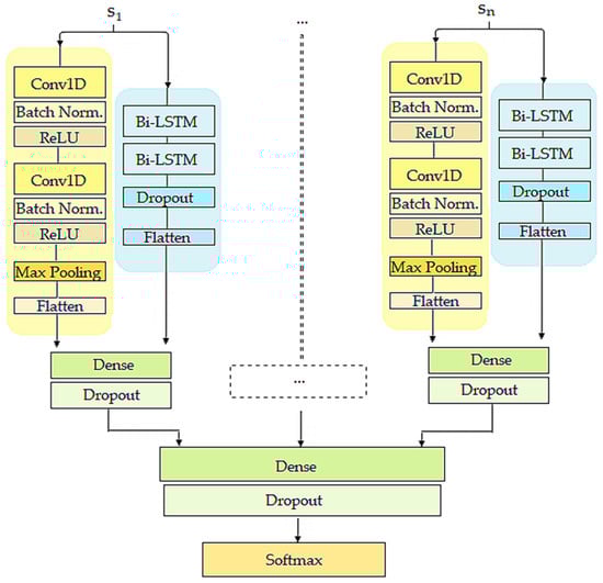 Both groups of learned features (spatial and temporal) for each signal are further fused into a fully-connected (dense) layer. This feature-level fusion projects the complementary temporal and spatial feature representations for each sensor signal into the same common space, thus enabling the further layers to discover internal characteristics of the signal structure from two different aspects. The outputs of these fully-connected layers are once more fused into another fully-connected layer. This layer is shared among all sensor signals, which means that it interprets the independent sets of weights respective to each modality. In other words, this layer takes into account all features that are learned for each sensor signal incorporated in the network architecture. To avoid overfitting, a dropout layer is also used after each fully-connected layer. Eventually, the final output of the network is provided by a softmax layer [44], which returns a class probability for each of the two classes. The overview of the proposed DL method is displayed in Figure 4.