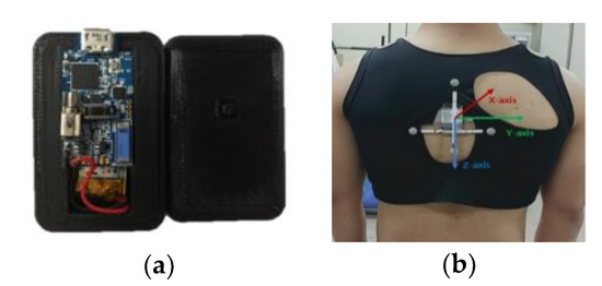 An MPU-9250 [35] (InvenSense, San Jose, CA, USA) sensor capable of measuring three-axis acceleration (±16 g), angular velocity (±2000°/s), and magnetism (±4800 μT) was used as the IMU sensor. An nRF52832 chip (Nordic Semiconductor, Trondheim, Norway) was used to receive the inertial data from MPU-9250 through I2C communication and transmit the same to a PC via radio frequency (2.4 GHz) communication. LabVIEW (National Instruments, Austin, TX, USA) was used to save the data on a PC as a .csv file. A webcam (SPC-A1200MB, Samsung, Seoul, Korea) and a 3D motion capture system (Vicon Motion Systems Ltd., Oxford, UK), which were synchronized with the IMU sensor sampled at 100 Hz, were used to record the video and marker data.