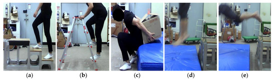 Examples of experimental motions: (a) climbing up and down stairs, (b) climbing up and down a ladder, (c) lifting (back), (d) 0.7 m jump, and (e) 0.7 m forward FFH.