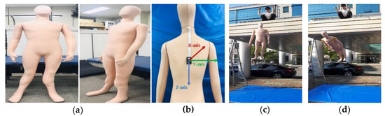 In experiments involving humans, it was not possible to perform FFH motions at great heights for safety reasons. Thus, to obtain inertial data on FFHs from great heights, we used a human mannequin (Madamade, Gyeonggi-do, Korea) (height: 180 cm; weight: 10 kg) made of soft and durable knit fabric to withstand the impact. Motions involving 0.7 m jump and 0.7 m forward FFH were performed to compare the data obtained using the mannequin with those obtained from humans. Since the mannequin cannot jump, the 0.7 m jump was replaced by a vertical free-fall motion at a height of 0.7 m. Then, vertical and forward FFH motions were performed at 2, 2.5, and 3 m. All the motions were performed five times. The IMU sensor was positioned as in the experiments involving humans. Figure 3 shows the mannequin used in the experiments, the position of the sensor, and examples of the mannequin experiments.