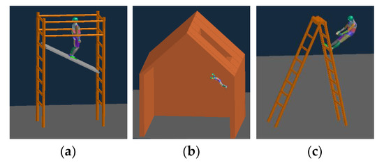 Zlatar et al. [36] analyzed 114 types of FFHs according to height, situation, and degree of injury. They reported that the most frequent FFHs occurred at heights between 3 and 6 m, and many FFHs occurred when working on scaffolds, roofs, and ladders. Dynamics simulations were performed based on these findings to obtain data on FFH motions when working on scaffolds, roofs, and ladders at heights of 3, 4.5, and 6 m. The inertial data were obtained at the same positions as those in the experiments involving humans. Figure 4 shows the motions in the dynamics simulations.