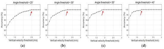 The threshold VA values were set to 25°, 30°, 35°, and 40°, and the threshold VV values were set from 1 to 3 m/s, with intervals of 0.1 m/s for each VA threshold. Then, accuracy was calculated according to the threshold combinations of the VA and VV (Figure 6). Four threshold combinations of the VA and VV (25°, 2.5 m/s; 30°, 2.2 m/s; 35°, 1.9 m/s; and 40°, 1.8 m/s) were obtained with 100% accuracy.