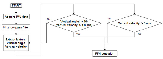 An algorithm using only the VV was necessary as the algorithm containing the VA could not detect FFHs in which the VA did not change. In the algorithm using only the VV, the threshold was set to 5 m/s; this was greater than the maximum VV of non-FFHs, namely, 4.14 m/s. Figure 7 shows the flowchart of the final algorithm developed for detecting pre-impact FFHs.