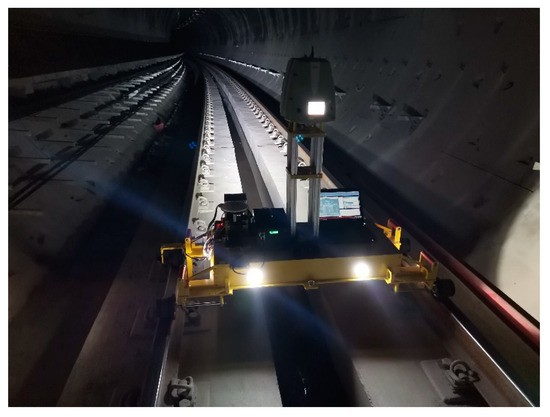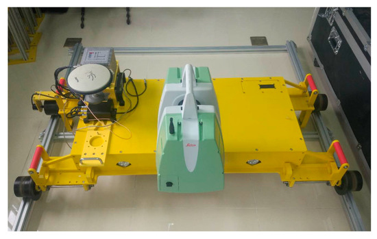 The tunnel mobile scanning system is mainly composed of Leica scanner P16, the NovAtel inertial navigation system, a rail car, notebook computer, and other parts. The Leica P16 scanner has a range accuracy of 1.2 mm + 10 parts per million (ppm), an angle accuracy of 8 “, and a field-of-view angle of 360° in the horizontal direction and 290° in the vertical direction. The scanning mode adopts cross-section scanning. The SPAN-FSAS inertial navigation system mainly includes a GNSS antenna, a NovAtel receiver card, and an inertial measurement unit and battery. The inertial measurement unit adopts a closed-loop fiber optic gyroscope with an acquisition frequency of 200 Hz. The rail car contains an electric motor and odometer that can run constantly on the track at five different speeds: 0.05 m/s, 0.20 m/s, 0.5 m/s, 1.0 m/s and 1.5 m/s.