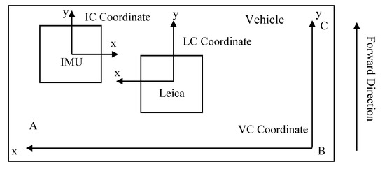 In this study, the IMU attitude angle static calibration used the total station to measure the coordinates of tunnel engineering coordinate systems of A, B, C on the rail car body. According to Equations (1)–(3), the attitude angle of the car at that time can be obtained. Then, compared with the attitude angle observed by IMU, the difference of the three-axis attitude angle between the IC coordinate system and the VC coordinate can be obtained. The average value is taken as the final result of IMU attitude angle static calibration, so the IMU coordinate system can be placed into the VC.