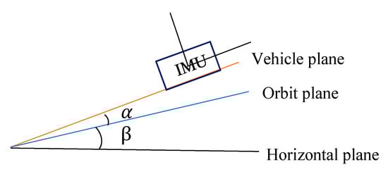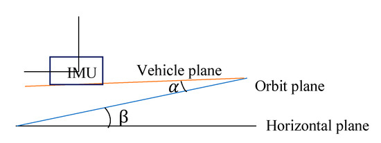 Back-and-forth measurements are used to calibrate the inclination of the rail surface. As shown in Figure 3 and Figure 4, α is the angle between the car body coordinate system and the rail surface coordinate system, and β is the actual inclination angle of the track. Before the actual tunnel operation, the IMU roll angle measurement is carried out every interval of a certain distance, and the car is rotated 180° to re-observe the roll angle at these five positions. Let the direct measured roll angle be and the reversed measured roll angle be ; subsequently, the correct inclination angle is and the included angle of coordinate system is . Therefore, we obtain the angle α between the car body coordinate system and the rail surface coordinate system to ensure that the point cloud under the car body coordinate system can be unified into the rail surface coordinate system.