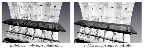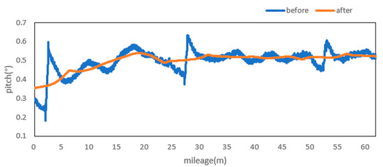 Attitude angle optimization is mainly divided into two parts: Filtering and correction. The moving average filter is used to filter the three attitude angles. Figure 9, Figure 10 and Figure 11 show the comparison curves of the pitch angle, roll angle, and heading angle before and after moving average filter, which shows that the attitude angle after filtering is more smooth and stable. Figure 12a,b shows the point cloud results obtained from the point cloud fusion of the two attitude angles before and after filtering at the same position. The more serious periodic point cloud change in Figure 12a can also be seen in Figure 12b; this change can eliminate the point cloud deformation caused by the random attitude angle error and the periodic system error caused by GNSS signal losing lock over a long period and restore the real structural information in the tunnel.