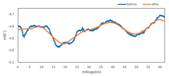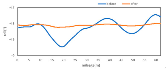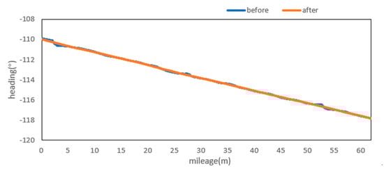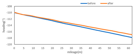 From the fusion formula of the relative point cloud, the influence of the pitch angle on plane line shape is relatively small. Figure 13 also shows that the pitch angle is approximately 0.4° to 0.5°, so the influence of the pitch angle on the plane line shape can be ignored in this experiment. The test section is located at the corner of the tunnel. The horizontal alignment is mainly a curve and the super elevation is relatively stable. Figure 14 shows that the roll angle fluctuates around −4.8°. To reduce the impact of periodic fluctuation, the fluctuation range of all roll angles in the test section was reduced 10 times, and the orange curve, as shown in Figure 14, was obtained. As shown in Figure 15, the heading angle deviation was corrected according to the average coordinate azimuth angle difference calculated above. The average angle difference of twice was evenly distributed to each heading angle in the test section, and the orange curve was obtained, as shown in Figure 15. The pitch angle had negligible influence on the plane line type, but its influence on the elevation was substantive. Therefore, the elevation angle was corrected according to the elevation difference between the starting and ending section reflectors. As shown in Figure 13, the orange curve is the corrected pitch angle.