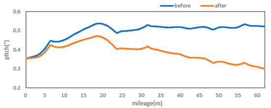 Table 3 shows the calibration parameter results of the rail surface inclination angle. The included angle between the track surface and car body plane was calculated by comparing the change of the roll angle in the round-trip measurement.