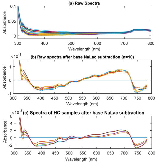 The (a) raw UV/Visible spectra of 37 samples with varying concentration of NaLac, (b) the raw spectra after base NaLac sample subtraction (0 mmol/l), and (c) base subtracted spectra of high concentration samples (100, 200, 300, 400, 500, and 600 mmol/L).
